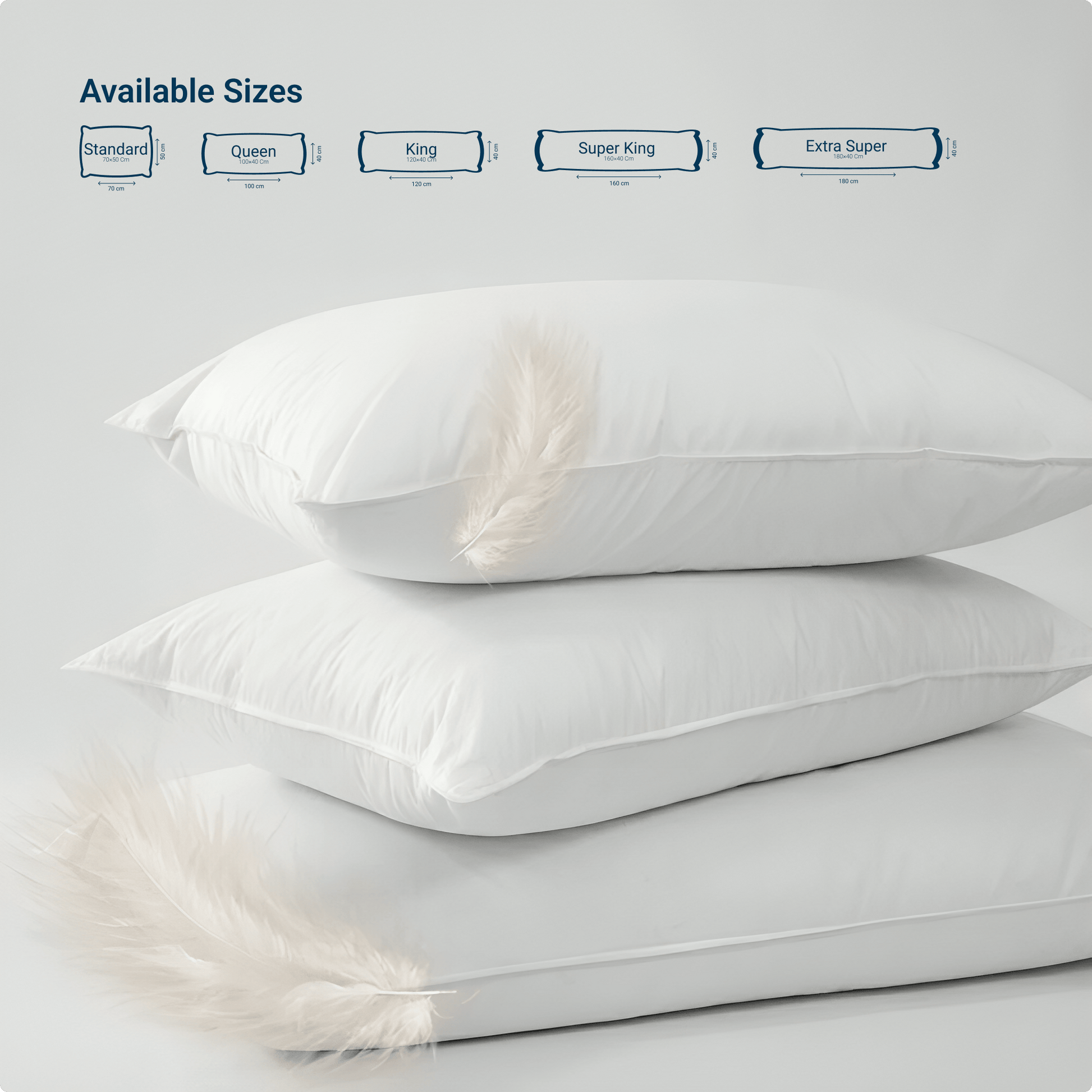 - تتوفر ٥ مقاسات: قياسية ٧٠ × ٥٠ سم، كوين ١٠٠ × ٤٠ سم، كينج ١٢٠ × ٤٠ سم، سوبر كينج ١٦٠ × ٤٠ سم، إكسترا سوبر ١٨٠ × ٤٠ سم، كل منها بأبعاد وأوزان حشو محددة حسب تفضيلك.